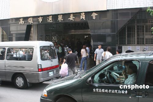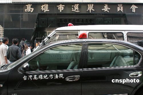 中国国民党高雄市长候选人黄俊英提起当选无效之诉,向高雄地方法院声请保全证据,要求查封全市全部选票、选举人名册、投开票报告表等,经法官裁定准予封存。图为十二月十日,各投票站的选票被装袋运抵高雄选举委员会楼后,多辆法院的专车运载法官前来查封选票。中新社发 耿军 摄