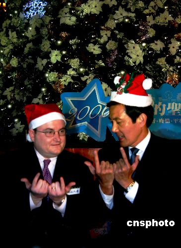 “二零零六台北的圣诞节”活动十二月十一日晚间在台北市政府旁边的广场上举行点灯仪式,图为即将卸任的台北市长马英九(右)参加点灯仪式,他在圣诞树前教外宾用手势比对台北的“北”字。中新社发 徐长安 摄