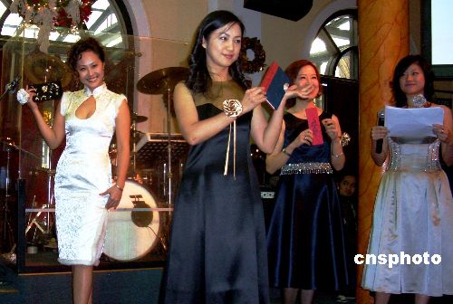 十二月十六日,上海台商圈内富有盛名的“一八八一”台湾职业女性联谊会举办盛大的圣诞慈善“走秀”活动,为内地贫困女童募集善款。图为一群台商太太身着盛装登上T台,展示爱心义卖的小礼物,轰动全场。中新社发 许晓青 摄