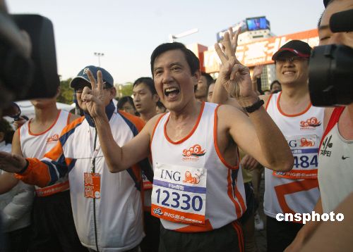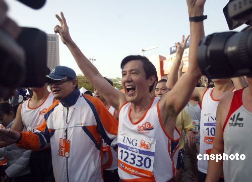 十二月十七日上午,二○○六台北国际马拉松赛开跑。已经连续三年参加马拉松赛的台北市长马英九照例参加。五十五分钟后,马英九跑完九公里赛全程,成绩较去年有所提高,这是马英九最后一次以市长身份参加马拉松赛。图为马英九跑到终点时的情形。中新社发 张炜 摄