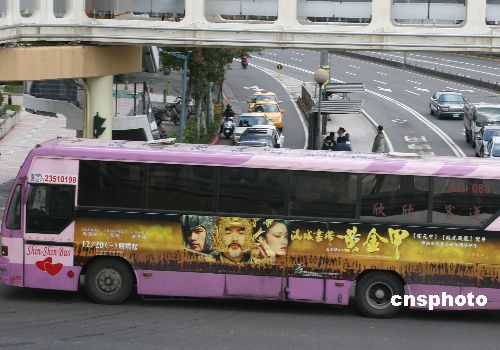 由中国著名导演张艺谋执导的古装大片《满城尽带黄金甲》将于12月20日起在台湾公映。图为张贴该片海报的公共汽车在台北主要街道上行驶。中新社发 董会峰 摄