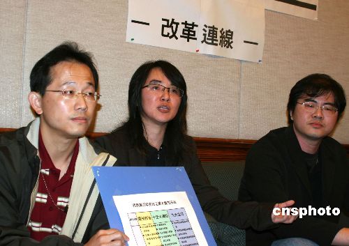 十二月二十日,由二十七名年轻人发起的中国国民党“立委”助理改革连线在台北成立。图为发起人之一程诗郁(中)发言。中新社发 董会峰 摄