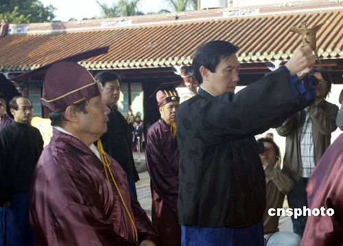 十二月二十四日上午,台北市文化局在台北孔庙举办“祭文祖仓颉”仪式,市长马英九、台北县长周锡玮担任献祭官,焚香进酒,感念汉字文化源远流长。这是马英九在台北市长任内参加的最后一次市政公务活动,二十五日,他将卸任。中新社发 张炜 摄