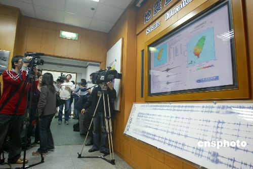 十二月二十六日晚八时二十六分,台湾地区屏东恒春近海发生里氏六点七级地震,八时三十四分屏东枋寮地震站又发生里氏六点四级地震,从南部到北部,全岛有明显震感。图为大批媒体记者当晚赶到台湾的地震主管部门进行采访。中新社发 张炜 摄