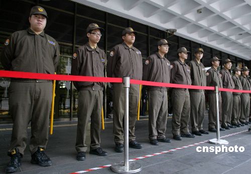 十二月二十九日上午,倍受关注的台湾“机要费案”在台北地方法院第三度开庭。主要被告人吴淑珍没有出庭,检察官张熙怀因心理压力过大请假,也没有出庭。由于法院门口的抗议活动不断,大批安保人员在地院门口守护。中新社发 张炜 摄