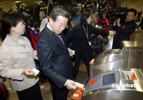 一月五日,台湾高速铁路开始试运营,普通民众可以购票试乘体验高速列车。当天上午,谢长廷偕妻子游芳枝来到板桥车站准备试乘高速列车。据此间媒体报道,此前因为没有受邀搭乘高铁,所以谢长廷自掏腰包购票乘车。中新社发 张炜 摄
