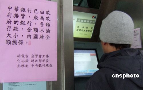 一月七日,一位市民在台北的“中华银行”柜员机上尝试取款,但没有成功。因力霸和嘉食化两家公司申请重整,引发“中华银行”储户严重挤兑,单日挤兑额近二百亿元台币,当地媒体惊呼“金融风暴”来了。台湾“金管会”宣布于六日凌晨开始正式接管“中华银行”,八日将提供三百亿台币现金应付提款。中新社发 张炜 摄