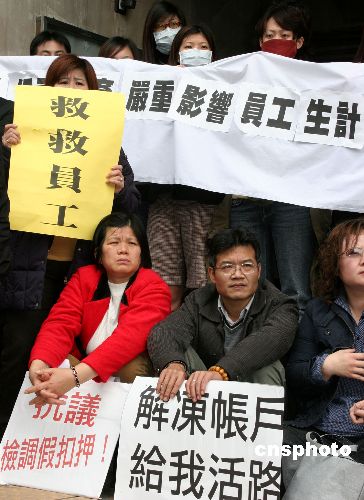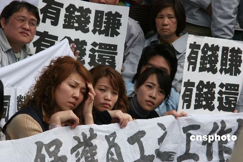 一月十一日,宜兰、桃园数十名力霸员工忧心生计不保,前往台北力霸集团总部、“行政院”、“立法院”陈情抗议。力霸财务风暴在台湾持续延烧,目前已有四十七人被限制出境。中新社发 董会峰 摄