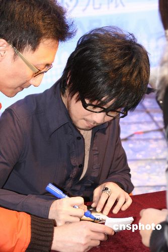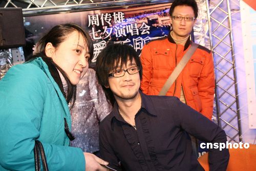 1月13日,周传雄在北京举办演唱会的签售答谢会。在签售会上周传雄不仅一一为歌迷签名,而且每张DVD都可以属上歌迷的名字,周传雄还与歌迷握手合影留念。中新社发 一可 摄