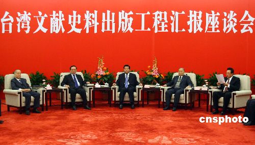 一月十七日,台湾文献史料出版工程汇报暨馆藏民国台湾档案汇编座谈会在北京人民大会堂举行。全国政协主席贾庆林、国务委员唐家璇等领导人出席座谈会。中新社发 廖文静 摄