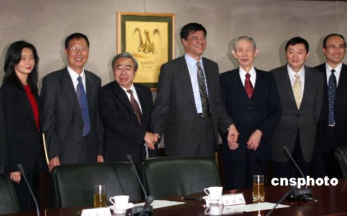 1月17日下午,正在台北访问的中国发改委宏观经济研究院顾问张晓强(中)一行,到台塑集团总部拜会该集团创办人王永庆(右三)和集团总裁王文渊(左三)。中新社发 黄少华 摄