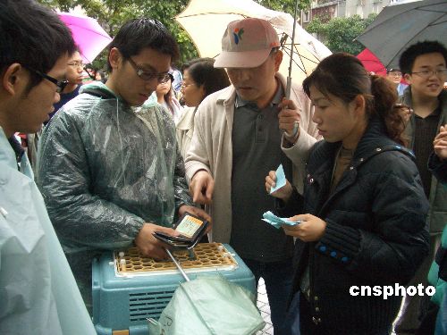 台湾云林县一宠物店老板近日自杀后,留下上百只名猫。岛内动物保护协会一月二十一日下午开放民众认养,引来数百民众冒雨排队领号码牌。中新社发 路梅 摄