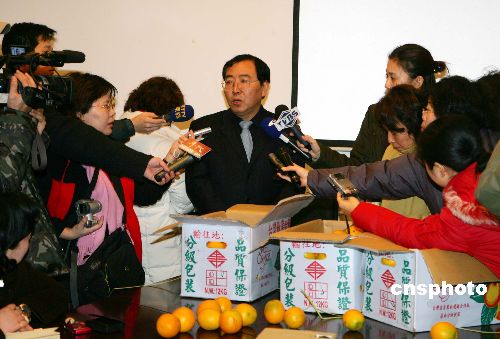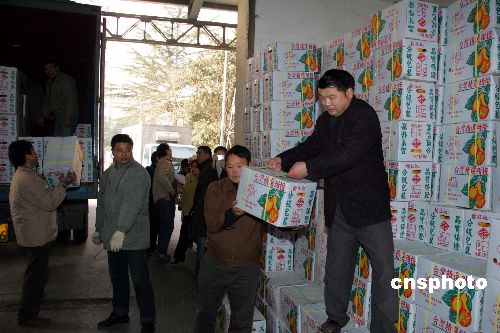 一月二十五日,首批六十吨台湾丰产滞销的柳橙进入上海市场,台湾柳橙将以每斤三元五角至三元六角参考促销价在上海各大超市销售。据悉,自一月二十一日起到二月十一日,共有四百六十吨台湾柳橙陆续运到上海,这是大陆方面再次帮助台农、启动紧急采购机制的重要举措之一。中新社发 潘索菲 摄