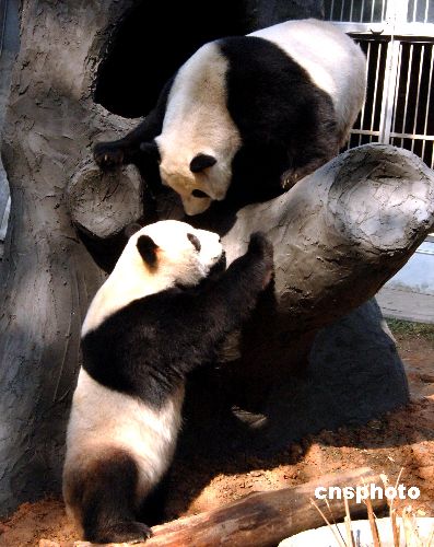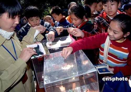 1月30日,福州熊猫世界的两只大熊猫明星福福、林阳与参加“2007·阳光海峡——两岸快乐小天使活动营”的闽台小朋友见面。其中来自台湾的四十多位小学生大多是首次亲眼看见大熊猫。中新社发 刘可耕 摄