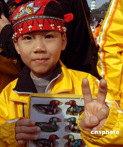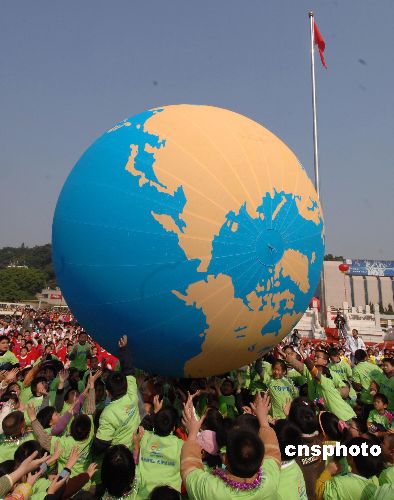 1月31日,参加“2007·阳光海峡——两岸快乐小天使活动营”系列活动的闽台少年儿童,在福州用他们的双手共同传递直径为3.5米、画有中国地图的大气球,使现场气氛达到高潮。当日,由福建省广播影视集团、少先队福建省工作委员会、台湾东森媒体集团共同主办的“2007·阳光海峡——两岸快乐小天使活动营”正式开营。中新社发 刘可耕 摄