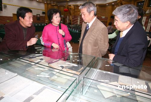 二月六日,“柏杨捐赠文献文物入藏新闻发布会”在北京中国现代文学馆举行,台湾作家柏杨的夫人张香华(左二)将11745件文献文物捐赠给中国现代文学馆馆长陈建功(右二)入藏文学馆。中新社发 廖文静 摄