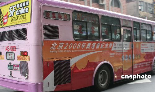 二月十六日,北京二00八年奥运会贵金属纪念币的广告登上了台北市的公交车。该纪念币由台湾大洋金银币有限公司代理经销。目前台北有三十一辆公交车刊登该广告。中新社发 陈立宇 摄