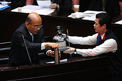 中新网3月20日电 据“中央社”报道,针对台当局拆除蒋介石铜像的政策,国民党“立委”江连福(右)20日故意将一尊蒋介石铜像,送给了在“立法院”接受质询的当局“行政院长”苏贞昌。苏贞昌一脸尴尬忙着喝水,喝过水后才将铜像收下。(王飞华)