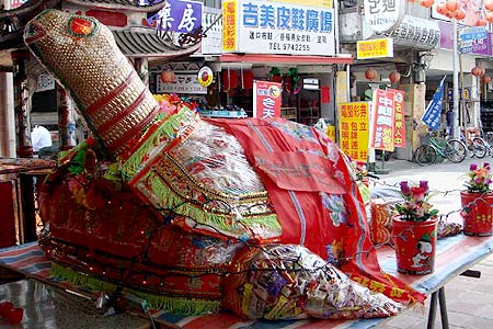 中新网3月21日电 据台湾《中国时报》报道,3月20日是农历二月初二,民间土地公生日,台南县玉井乡北极殿特地举办乞龟仪式敬拜,炉主基于方便搬迁,打造两只大型米龟,其中大型米龟重达1007台斤(1台斤约为600克)。(曹婷婷)