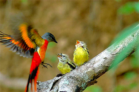 中新网4月5日电 据台湾《中国时报》报道,目前正值鸟类繁殖期,台湾省嘉义县阿里山乡茶山部落的山林里,灰喉山椒爸爸正忙着哺育小宝宝。(庄哲权)