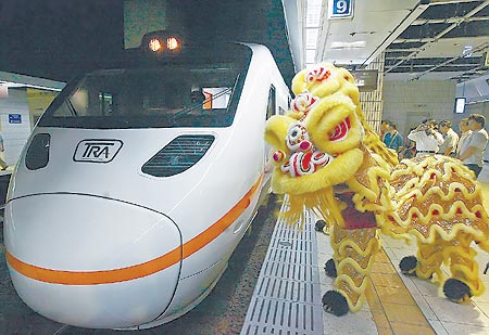 中新网5月9日电 据台湾《中国时报》报道,台湾铁路东部干线倾斜式新列车“太鲁阁号”8日首航,并请来舞狮在月台上庆贺。太鲁阁号共8节车厢可乘坐380位旅客。从台北到花莲,最快直达车只要1小时59分。(陈麒全 摄)