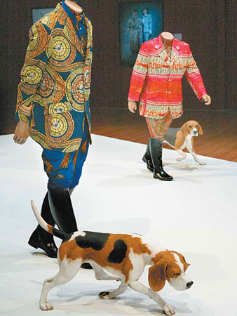 中新网5月25日电 据台湾《中国时报》报道,台北当代艺术馆二十六日起展出“流行的意外”,邀请到多位目前在世界上当红的艺术家。图为尼日利亚艺术家因卡修尼巴尔(Yinka Shonibare)的作品《猎犬》,穿着不同文化图案样式的英式绅士,带着几只猎犬追补狐狸,代表人类的历史就是一种文化大猎杀。(王远茂)