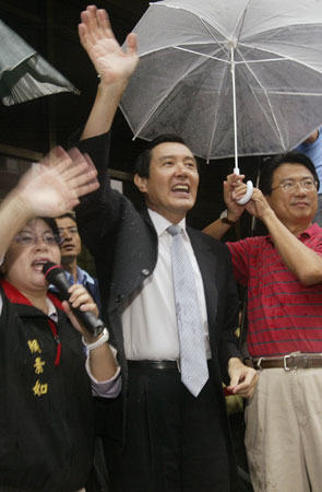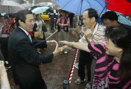 中新网6月5日电 据“中央社”报道,中国国民党二00八参选人马英九台北市长任内特别费案今天上午第五度开庭,民众在台北法院外顶着伞为其加油,马英九步入法院前也挥手向在雨中守候的支持者致意。(苏圣斌)