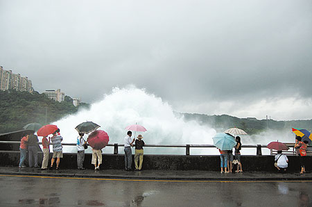 中新网6月28日电 据台湾《中国时报》报道,台湾气象部门发布山区豪雨特报,桃园县石门水库昨日下午四时实施调节性排洪。图为游客正在观赏石门水库泄洪壮观景象(胡欣男)