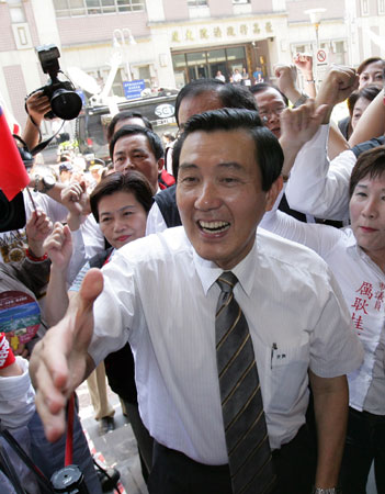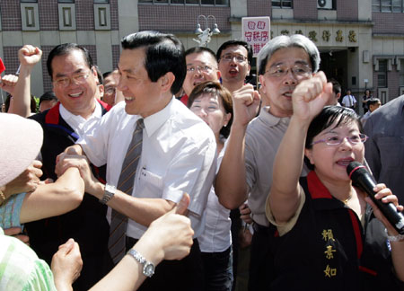 中新网7月3日电 据“中央社”报道,台北法院今天第六度开庭审理前台北市长马英九特别费案,辩方传唤的三名证人都是马英九市长任内的办公室秘书。图为国民党二00八参选人的马英九在国民党“立委”及支持者的簇拥下步入法庭。(张皓安)
