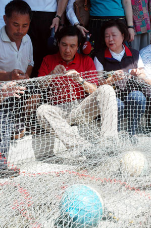 中新网7月13日电 据“中央社”报道,国民党二00八参选人马英九十三日下午到彰化线西乡的塭仔渔港参观,为了体验渔民的辛劳,马英九向渔民学习补渔网的技巧。(吴哲豪)