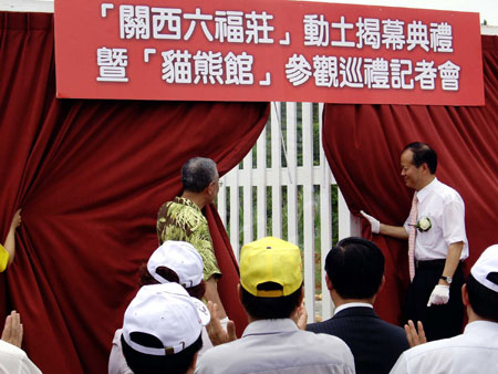中新网7月31日电 据“中央社”报道,台湾新竹六福村三十一日中午召开六福庄动土暨熊猫馆开幕典礼,表现出争取熊猫来台复育的强烈愿望,县长郑永金希望台当局“农委会”能给私立动物园一个机会。熊猫馆仿熊猫天然栖息地兴建而成,占地约有一点二公顷。(张静茹)