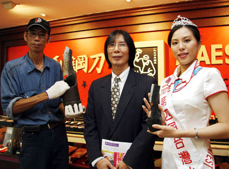 中新网8月24日电 据“中央社”报道,第四届台湾小姐第二名洪紫玮(右)二十三日随同台湾画院院长王海峰(中)到金门进行文化交流,参观炮弹钢刀厂。(倪国炎)
