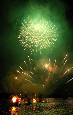 中新网8月27日电 据台湾《中国时报》报道,七月鬼门开,基隆中元祭二十六日举行放水灯祈福活动,图为壮丽的烟火搭配祈福水灯,形成炫丽的画面。(郑立琦)