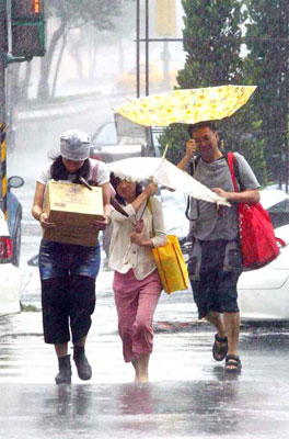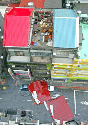 中新网10月8日电 据台湾《中国时报》报道,罗莎台风来袭,强风把台北市开封街与中华路口民宅铁皮屋顶都给吹翻,砸落街道造成两辆汽车半毁,开封街交通并因此封锁无法通行。在强风吹袭下,路上行人撑着伞,雨伞频频开花,显得相当狼狈不堪。