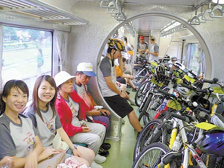 中新网10月10日电 据台湾《中国时报》报道,台铁九日宣布,预计二00九年起,新购的三百七十辆新车,前后两端都会设置脚踏车摆放区,供旅客携带自行车共乘,只要多买张票,就可以让自行车搭乘台铁。图为台铁目前提供部分团体包租台铁车厢方式,让自行车也能上火车,吸引不少年轻自行车族群。