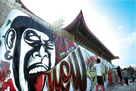 中新网10月22日电 据台湾《中国时报》报道,昨日天气晴朗,民众纷纷外出走动,台北“中正纪念堂”内虽然有两厅院屋宇修复工程,却也举行快乐涂鸦活动,邀请涂鸦高手在围篱上一展身手,为修缮中的两厅院增添了不同的面貌。