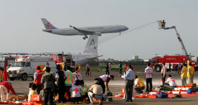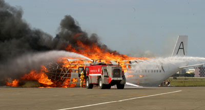 中新网10月24日电 据“中央社”报道,台湾桃园机场二十四日举行年度场内空难灾害抢救演习,图为模拟客机失事起火,消防车紧急赶到现场喷洒泡沫灭火剂画面。