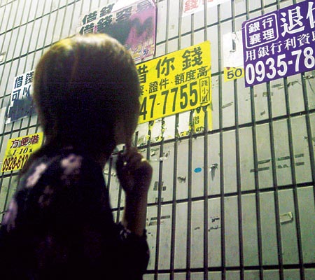 中新网11月1日电 据台湾《中国时报》报道,台当局“行政院”十月三十一日通过“融资公司法”草案,被外界视为“地下钱庄”将可顺势合法化,草案内容规定自然人年利率上限为百分之二十,法人的上限为百分之三十。图为市面街道的借贷放款小广告。