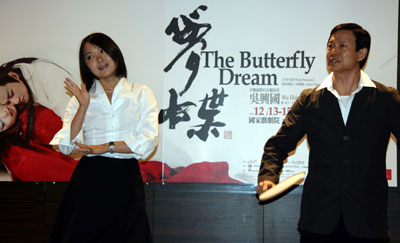 中新网11月2日电 据“中央社”报道,台湾当代传奇剧场新创昆曲风歌剧《梦蝶》十二月十三至十六日将在戏剧院演出。在昨天的记者会中,作为男女主角的京剧名角吴兴国(右)与昆曲名伶钱熠(左)现场表演一段“搧坟女与庄周”。