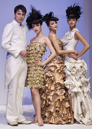 中新网11月8日电 据台湾《中国时报》报道,台湾服装设计师潘宜良的时装作品七日在北京时尚周展示,台湾名模黄志玮(由左至右)、蔡淑臻、陈思璇与林嘉绮跨海登台走秀,展现台湾在时尚产业中的魅力。