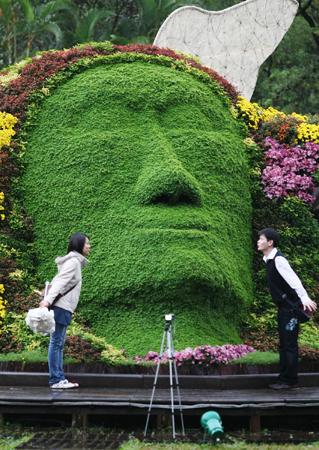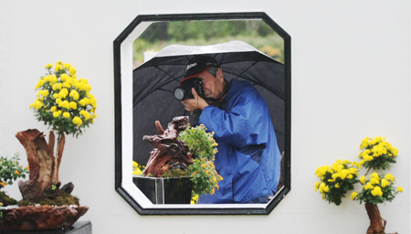 趁着米塔台风还没把花吹谢,一位民众二十六日午后脖子夹着雨伞,在台北士林官邸菊花展上尽情拍摄精心布置的菊花,这里也是蒋介石当年住地之一。“中央社”图 徐肇昌 摄