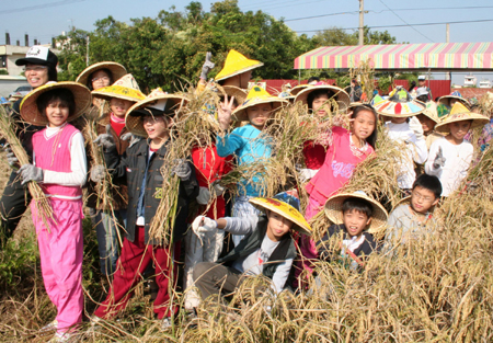 台湾省南投县草屯镇炎峰小学四年级学生日前体验水稻插秧,经过一期的水稻长成,小小农夫三十日下田收割,体验农民收割稻谷的辛苦与欢欣。“中央社”图 曾立 摄