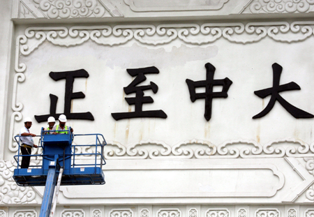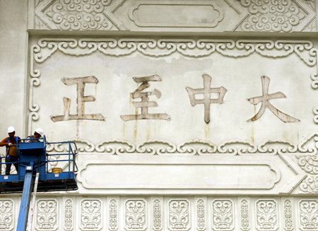 台北中正纪念堂前面的“大中至正”牌匾拆卸工程七日下午进行顺利,拆下最后的“正”字,牌匾岁月痕迹明显。图为拆卸前后对比。“中央社”图 郭日晓 摄