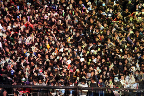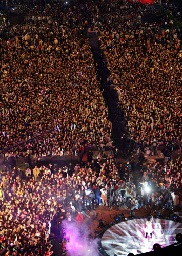 台北市政府前广场十二月三十一日举办“2008台北最HIGH新年城”跨年晚会,炫丽的舞台灯光和精彩的艺人表演,吸引上万的民众一起前来参加跨年晚会。(“中央社”图;张皓安摄)