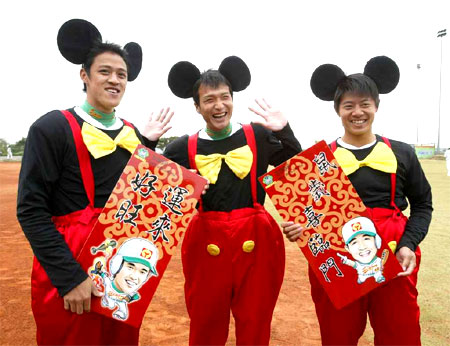 台湾职业棒球明星投手(右起)林其纬、蔡明晋、沈福仁,十六日在球场春训开训典礼中,搞笑巧扮米老鼠,向球迷拜早年,并期许球队鼠年再创巅峰。台湾《中国时报》图 蔡明德 摄