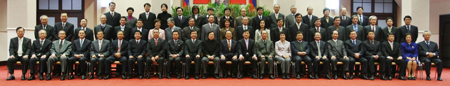 台湾当局“行政院”二十四日下午加开临时“院会”,通过总辞案。“行政院长”张俊雄和全体成员拍“毕业照”留念。面对媒体关切和询问,他不愿发表意见。“中央社”图 苏圣斌 摄