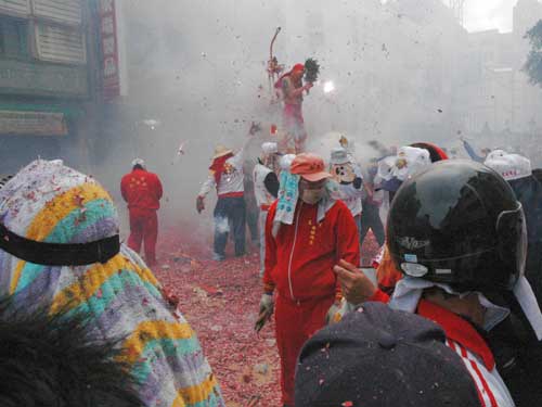 台湾台东元宵节重头戏“炮炸寒单爷”二月二十一日下午登场,肉身寒单爷穿着短裤、手持榕树叶接受鞭炮轰炸,民众全副武装感受震撼的场面。(“中央社”图)