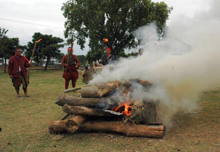 台东少数民族的三十多个部落将于“二二八”纪念日当天集体燃放狼烟,二十七日各族群代表在卑南人卡地布部落点燃火苗。台湾少数民族部落放狼烟有两种情况,一种是狩猎时,猎人们单纯联络;另一种是部落狼烟,各族群要表达意思大同小异,主要是与天神沟通的语言,有请示、告知、响应的意义。“中央社”图 卢太城 摄
