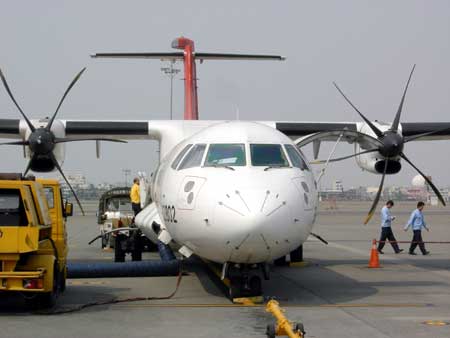 油价居高不下加上高铁冲击,令台湾航空业者的“寒冬”雪上加霜,部分航空公司改以双螺旋桨飞机飞航岛内航线。“中央社”图 程启峰 摄
