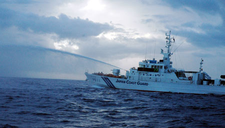 台湾“全家福”保钓船十六日搭载着保钓人士前往钓鱼岛宣示“主权”,不过,日本保安厅巡逻舰出动十多艘,还喷水、企图碰撞、排黑烟、及蛇行引侧浪企图阻挠。保钓人士丢掷饮料瓶抗议。“中央社”图